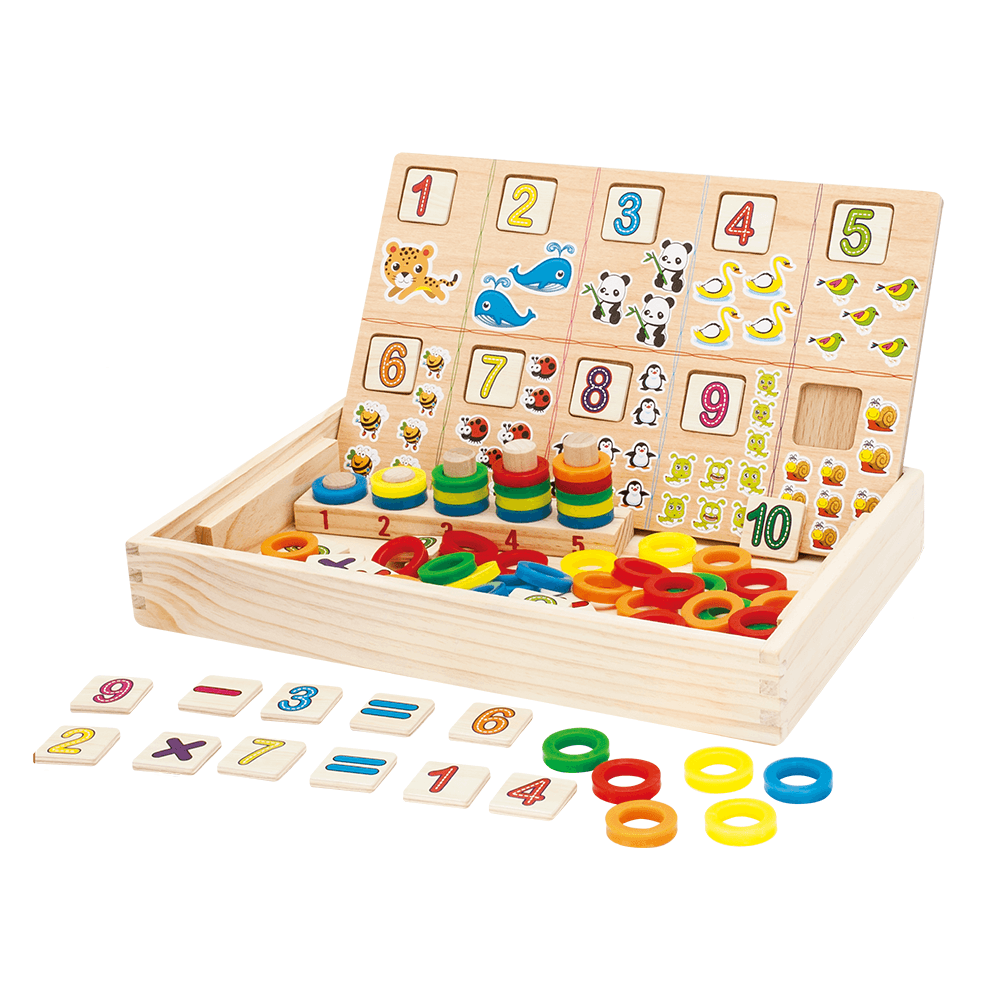 A Caixa Multifuncional É Um Centro de Atividades em Madeira Projetado para o Aprendizado Lúdico de Matemática e Contagem para Crianças a Partir de 4 Anos. Este Brinquedo Educativo Estimula o Raciocínio Lógico e a Coordenação Motora com Diversas Ferramentas: As Argolas Coloridas e Pinos Ajudam Na Associação de Números e Quantidades, Enquanto As Peças de Encaixe Introduzem o Reconhecimento de Números e Símbolos Matemáticos.