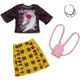 conjunto de Moda com Uma Roupa e Dois Acessórios Para Criar Uma Aparência Completa. Vem com Uma Blusa com Estampa de Unicórnio, Uma Saia Xadrez, Uma Mochila Rosa e Um Colar Para Completar o Visual.