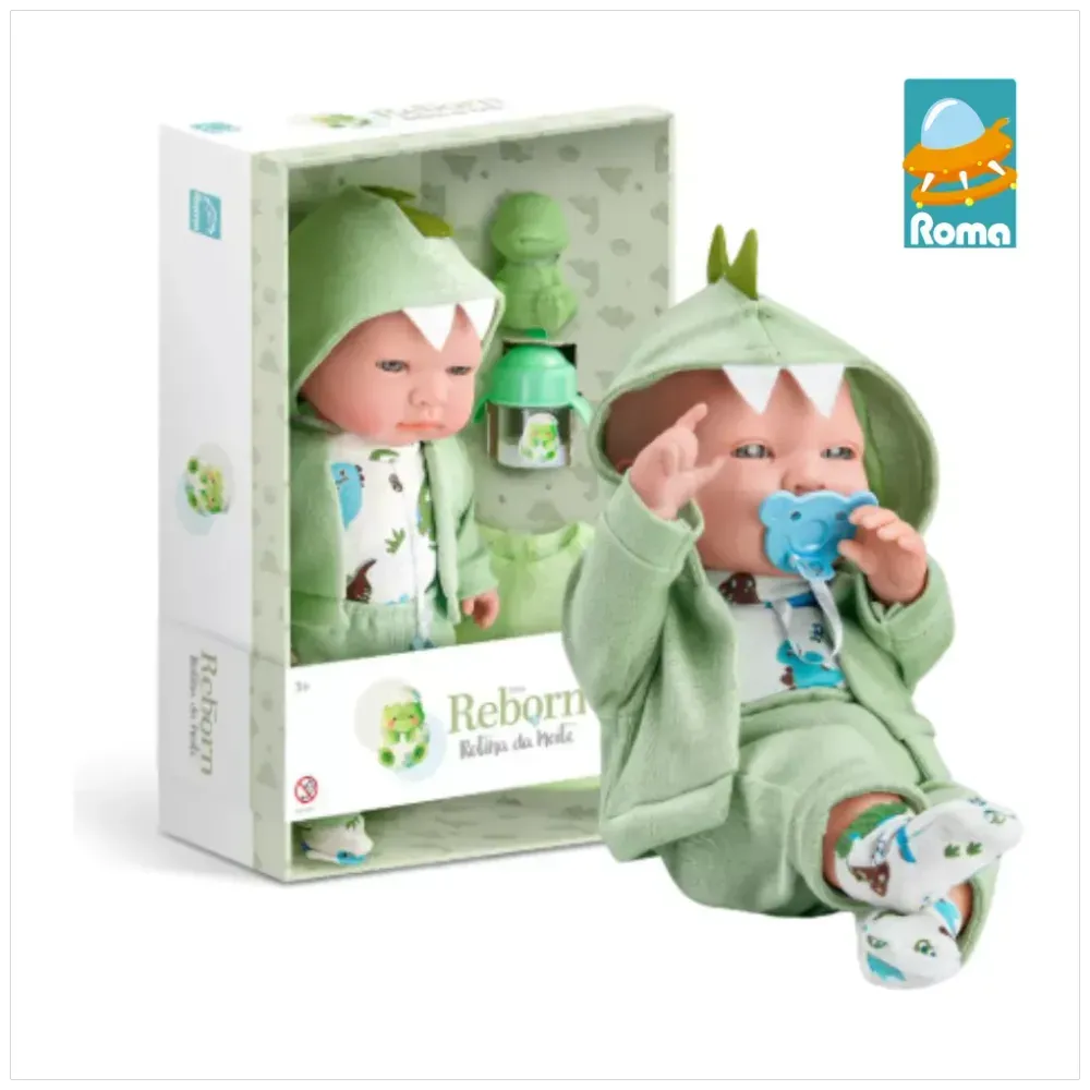 Boneca Bebê Reborn com Cabelo, Feita com Vinil Macio de Alta Qualidade e com Irresistível Cheirinho de Bebê. Rica em Detalhes. Vestida com Roupinha Verde Temática de Dinossauro, Ela Acompanha Acessórios Como Chupeta, Mamadeira Mágica, Fraldinha e Brinquedo, Estimulando o Desenvolvimento da Empatia e Responsabilidade Desde Cedo. Sensação de Carregar Um Bebê Recém-Nascido de Verdade.