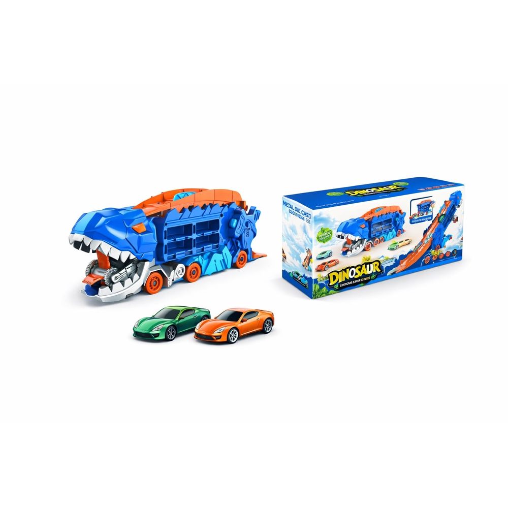 O Caminhão Transportador de Carros em Forma de Dinossauro T-Rex, com Carrinhos de Liga Metálica de Alta Qualidade e Uma Pista Dobrável, Proporciona Uma Experiência Inovadora para As Crianças Brincarem No Tempo Livre e Se Reunirem com Amigos e Familiares. Corridas a Qualquer Hora e em Qualquer Lugar!