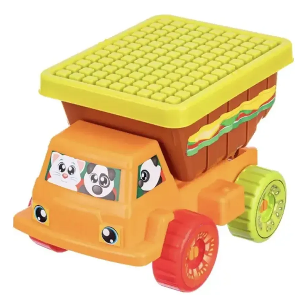 Caminhão Basculante com Rodas Livres, Caçamba Que Levanta e 15 Blocos de Diversos Tamanhos e Cores para Encaixar. o Caminhão Mede Aproximadamente 25cm de Comprimento.