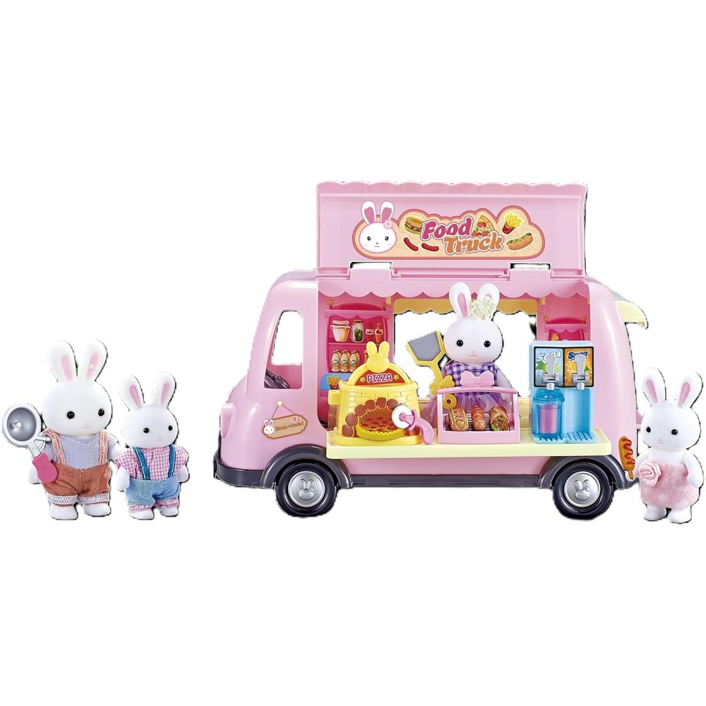 Food Truck com Diversos Acessórios Coloridos e Deliciosos. Vem com 2 Figuras da Família Coelho: Mãe e Filha. Acompanha 1 Cachorrinho. o Food Truck Tem Uma Cor Rosa Pastel e Mede Aproximadamente 25cm de Comprimento.