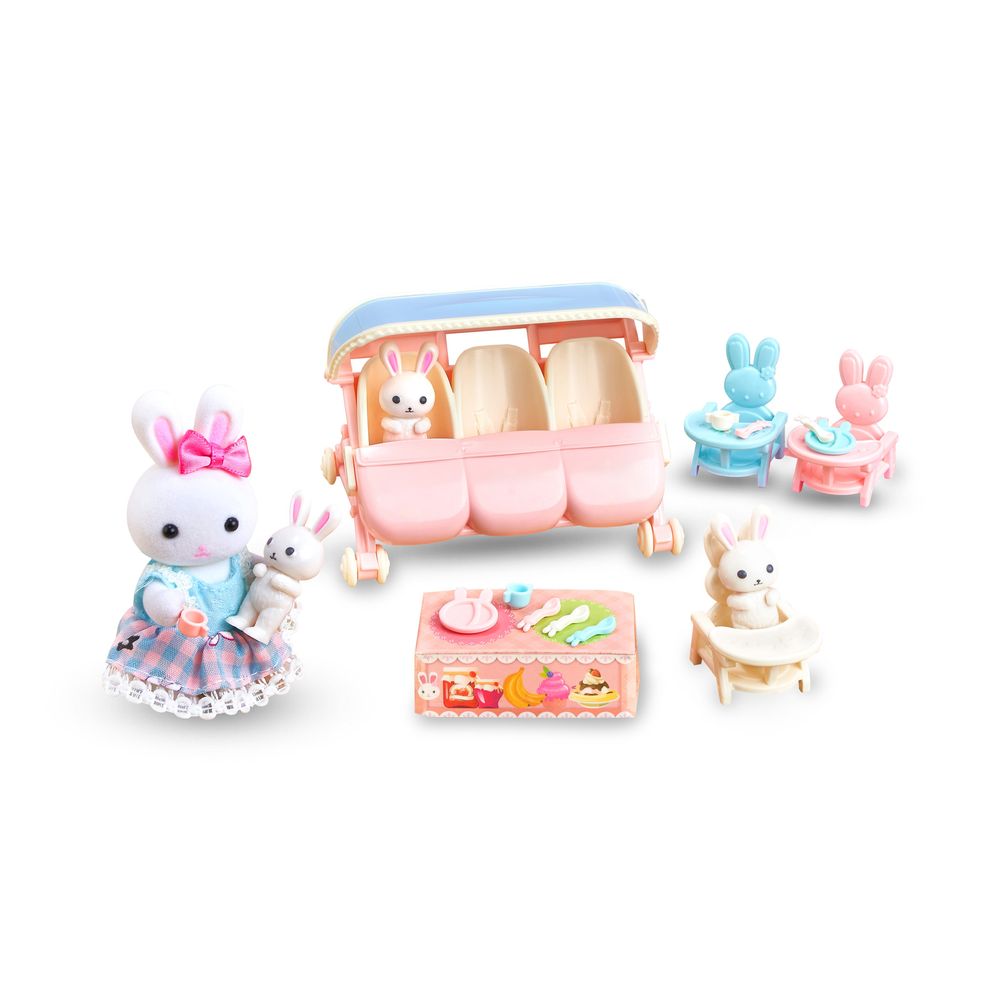 Kit Baby Carrinho de Trigêmeos com Diversos Acessórios Coloridos. Vem com 1 Figura da Mãe Coelha e 3 Figuras de Bebês Coelhos.