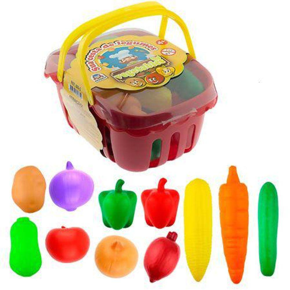 Cesta com 11 Legumes de Plástico: 1 Acelga, 1 Batata, 2 Cebolas, 1 Cenoura, 1 Milho, 2 Pimentões, 1 Pepino, 1 Tomate e 1 Beterraba.