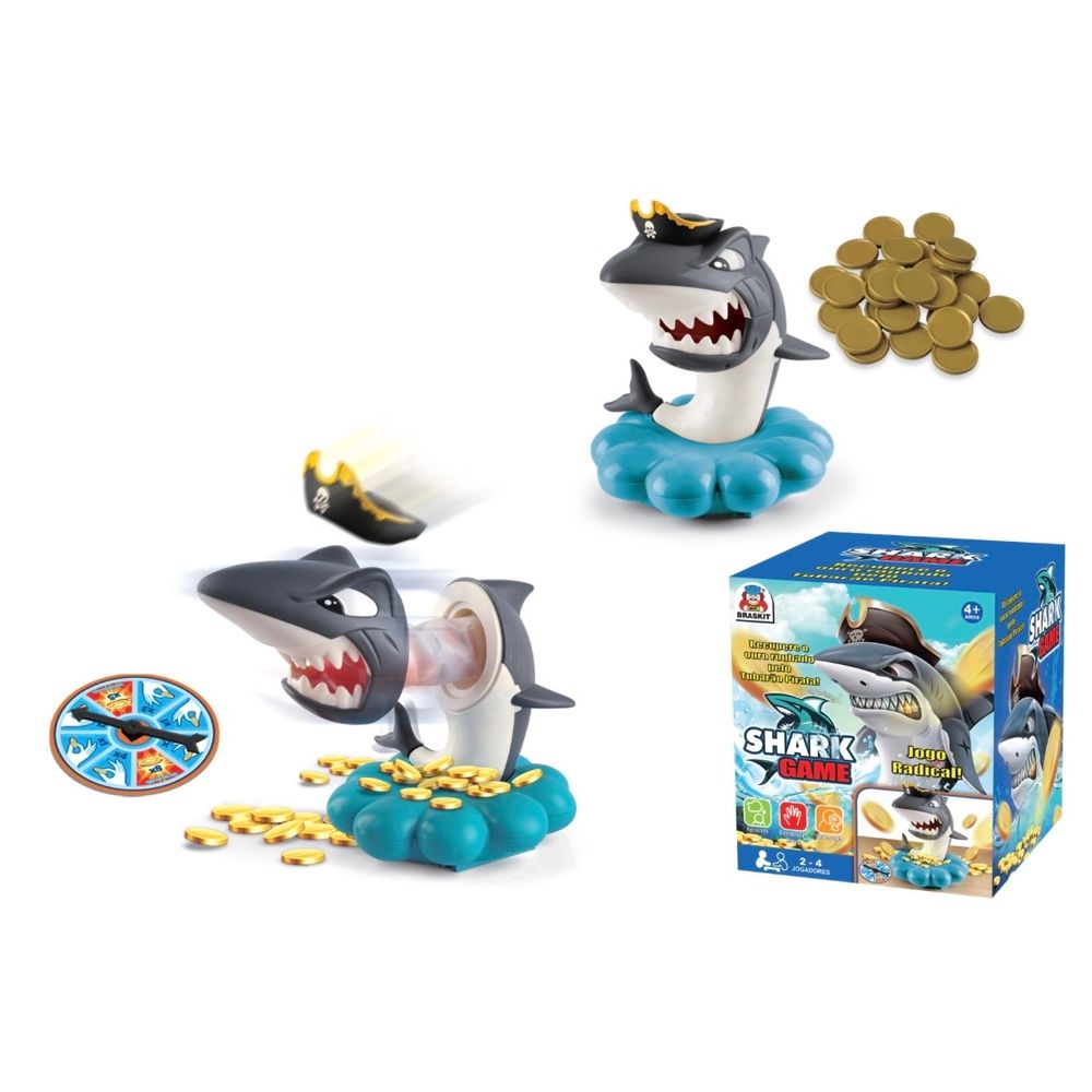 Recupere o Ouro Roubado Pelo Tubarão Pirata! Coloque As Moedas de Ouro Sobre a Base do Tubarão. Gire a Roleta e Tente Pegar As Moedas Conforme a Quantidade Sorteada. Cuidado para o Tubarão Não Acordar e Atacar! Vence o Jogo Aquele Que Tiver Mais Moedas de Ouro.