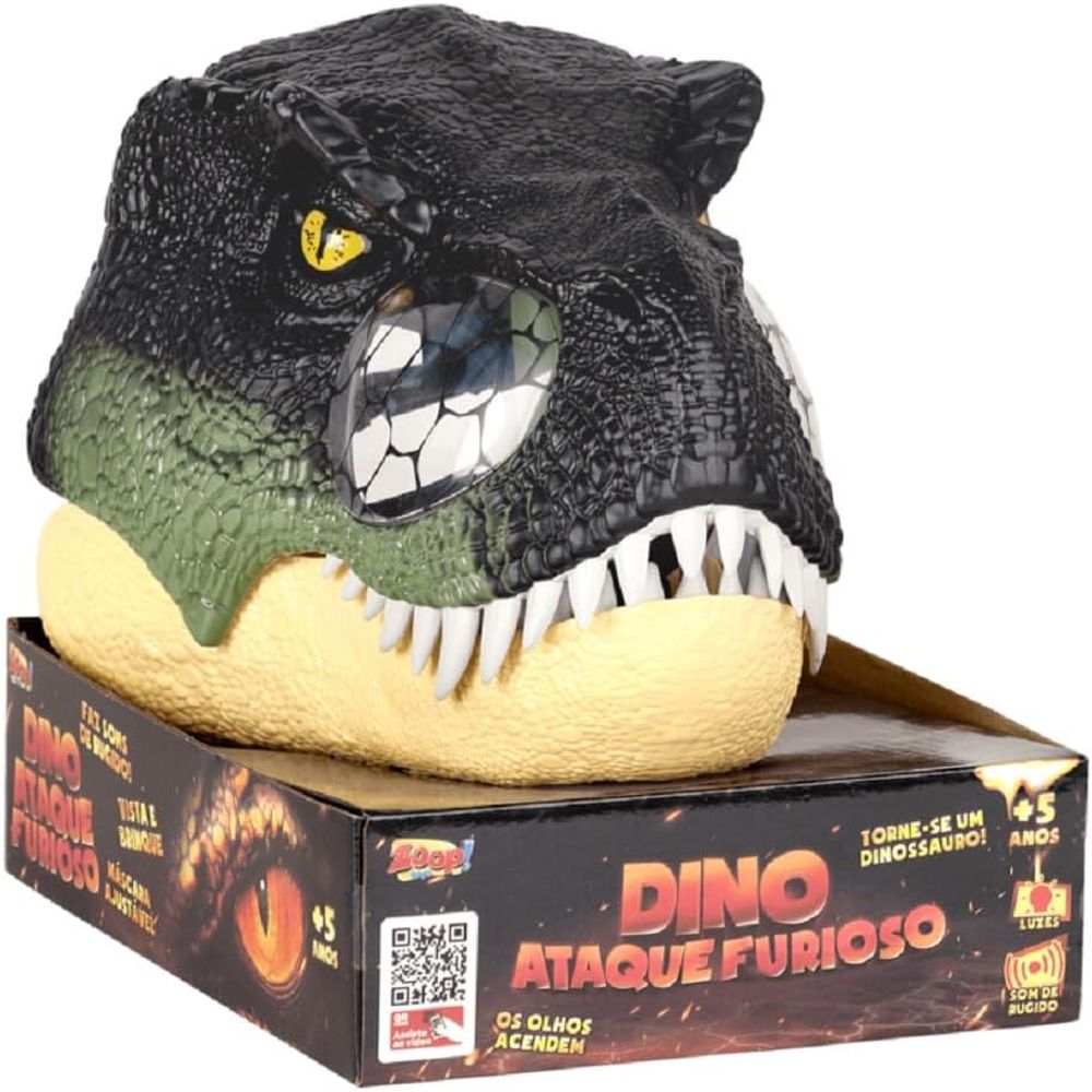 A Máscara Dino Ataque Furioso É Irada! Possui Cinto e Velcro Que Se Ajustam Na Cabeça, Mobilidade da Mandíbula, Olhos Acendem e Ainda Emite Sons de Dinossauro Ao Abrir a Boca.